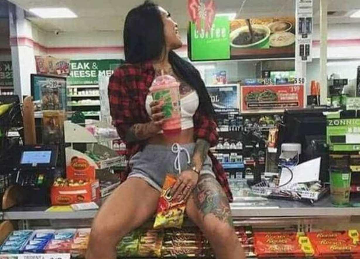 Although she is clearly just having a good time, the cashier would prefer if the customer observed proper convenience store etiquette. Pardon me, ma’am, the management values your patronage, but sitting on the glass counter is against the rules. They request that you please move from that spot at your earliest convenience. Thank you!